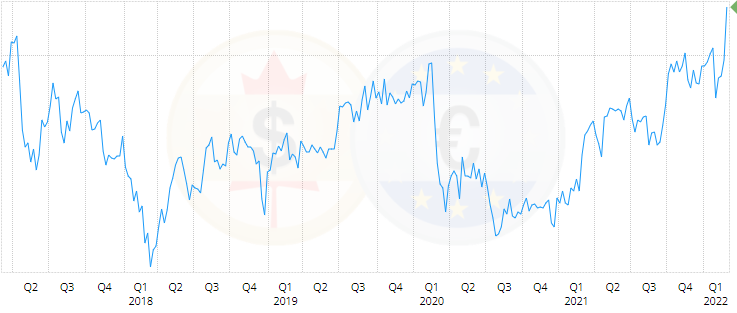 5% cheaper to buy your Euros now than 4 weeks ago. Buying €200,000 is now CAD$13,882 cheaper. |